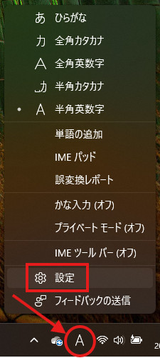 タスクバーの右下の下記場所を右クリックして「設定」を選ぶ