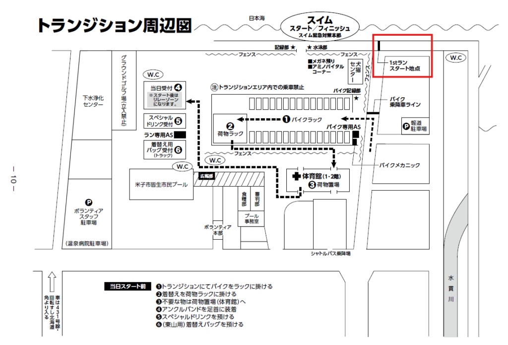 トランジション内への持ち込みは、バイク及び競技に必要な用具を入れたトランジション