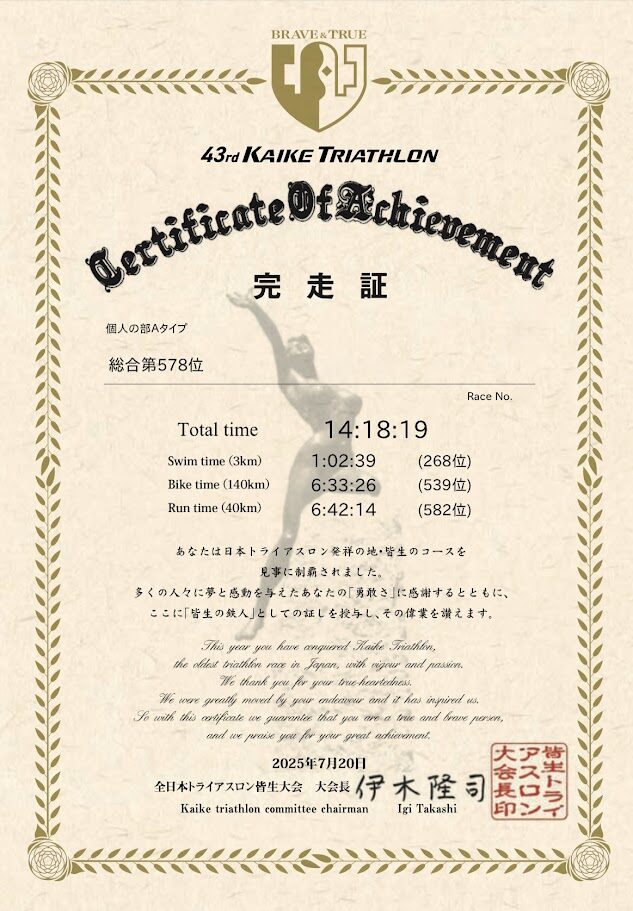 レースお疲れ様でした。見事にお会い出来ましたね!初の皆生でしたがエグいバイクコースにやられました。私もランは歩きまくりでエイドの水ぶっかけを希望に進みました!