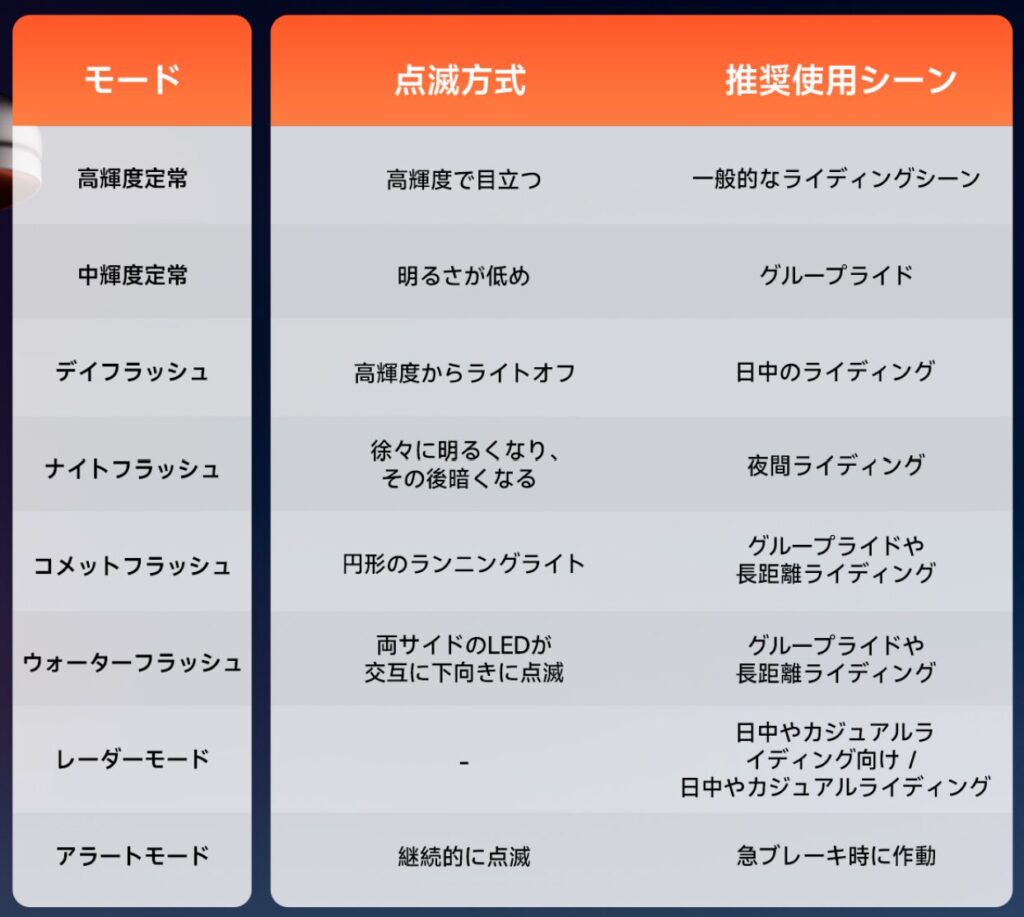 テールライトとしてのいろいろなモードがあって機能も充実してます!