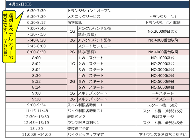 ・6:30~トランジションオープンでバイクセッティング可能で1時間以内に