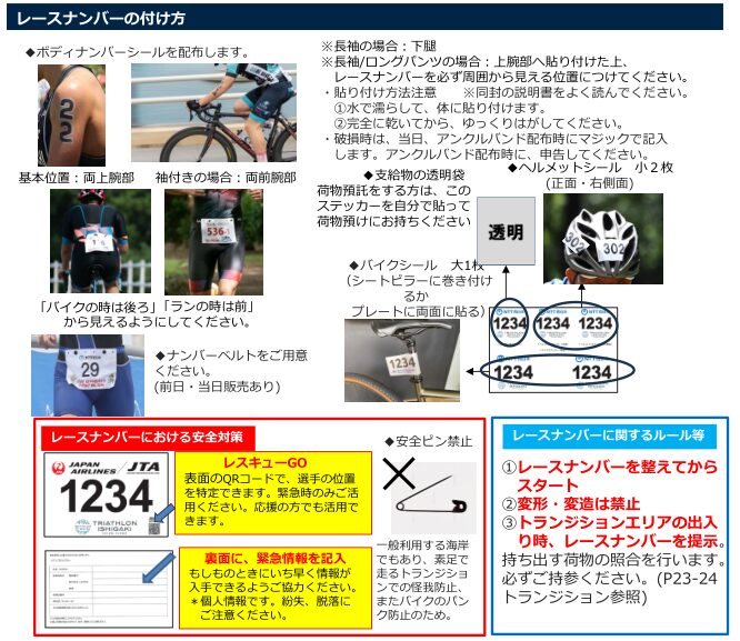 ・ゼッケンベルトは一つでOK。バイクは背面、ランは前面から見えるように!