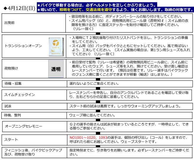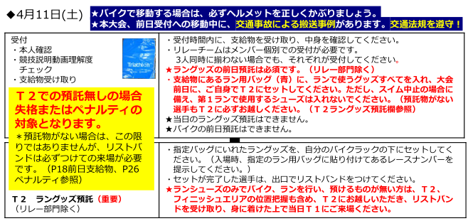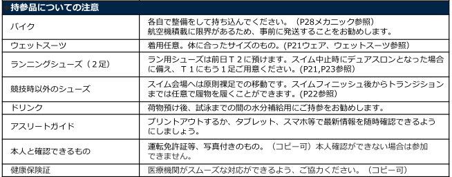 ・ドリンク、ジェル、保冷グッズ(送風機などは不可)などを持ち込むことはできますが、T1では白、T2では青の袋に、それぞれトレンジションから出る前に完全に入れてからスタートしてください。