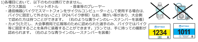 スマートホン等のカメラ、通信機器の携行はできません。ただし、大会事務局許可選手のみ、右のようなレースナンバーをつけて、スマートホン等のカメラを手に持っての撮影が認められます。