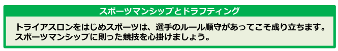 ・ドラフトゾーンに入ることができるのは、トランジションエリア前後100m、急なターン地点等です。